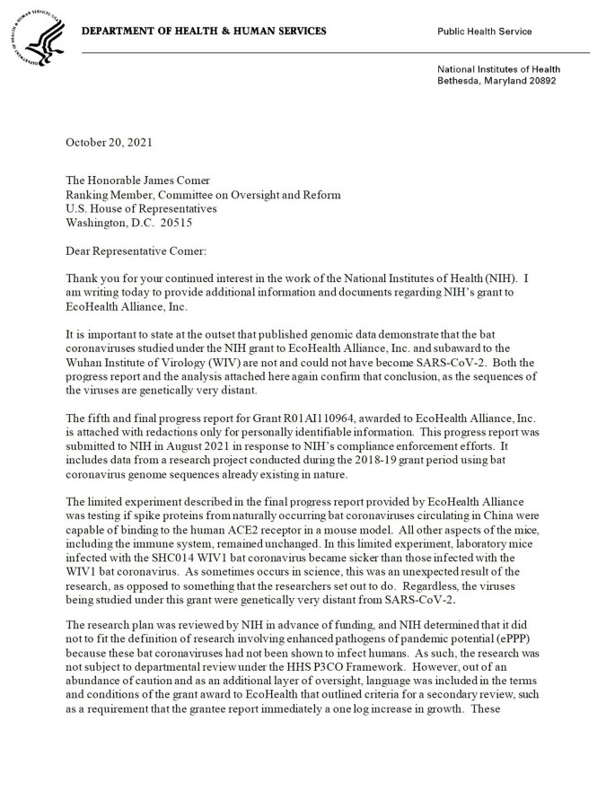 - A top NIH official has admitted to US funding in a letter written to Congressman James Comer. Lawrence A. Tabak, principal deputy director of the NIH however, has insisted that bat viruses studied under NIH grant could not have become Covid-19.