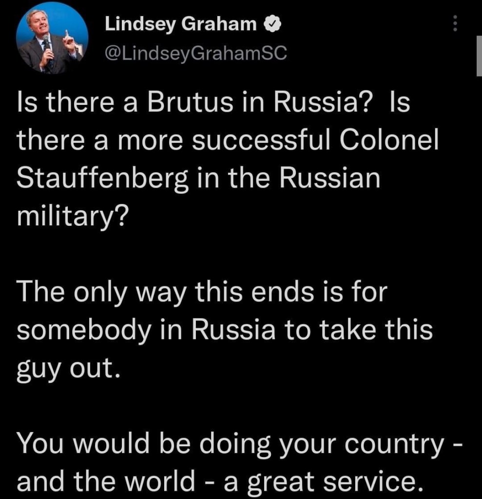 “Is there a Brutus in Russia? Is there a more successful Colonel Stauffenberg in the Russian military?” Graham, a Republican, tweeted Thursday evening, referring to historical figures who betrayed and killed or sought to kill their leaders.