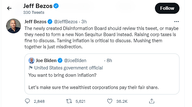 “In fact, the administration tried hard to inject even more stimulus into an already overheated, inflationary economy and only Manchin saved them from themselves. Inflation is a regressive tax that most hurts the least affluent. Misdirection doesn’t help the country,” Mr. Bezos tweeted.